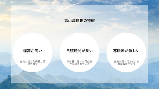 長年の研究により、平地で育った植物よりも、過酷な環境で育った高山植物の方がお肌に対する有効成分が遥かに高いことが分かりました。DR PLANTのスキンケア化粧品は空気が薄く、日照時間も長く、寒暖差の激しい過酷な高山で丁寧に育てた植物から抽出した美容成分を配合しています。