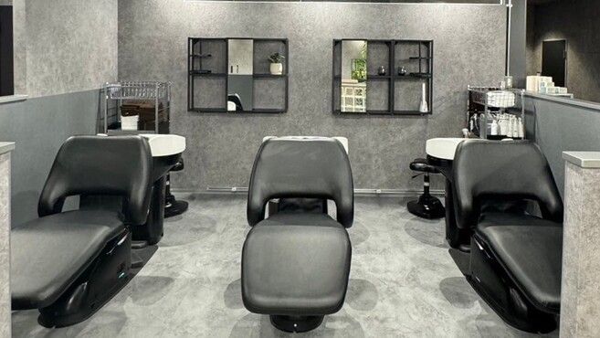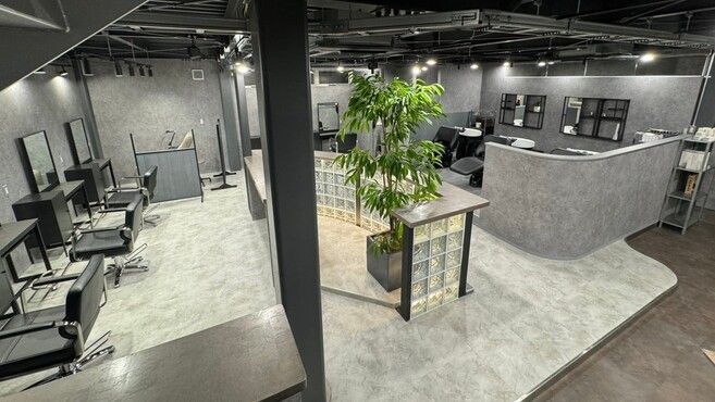 1Fフロアは美容室セット面6席。モノトーンとお洒落なガラスブロックで広々とした空間!