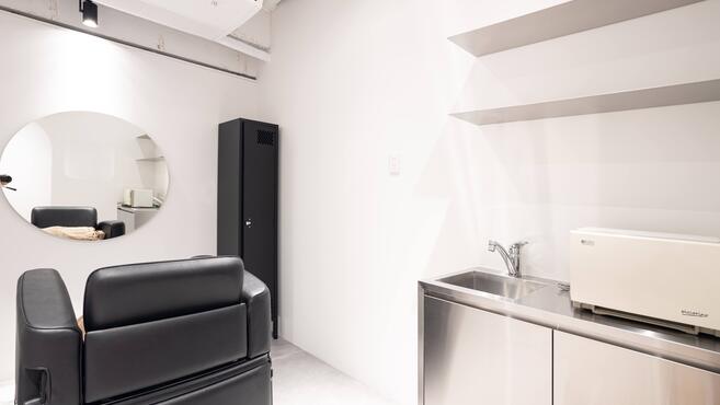 埼玉初のセットイス!イスの中にシャンプーYUMEボウルが収納される『MINIMAL SALON UNIT ONE』足も伸ばせるリクライニング式チェアーになります。