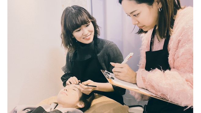 入社初日は1日かけて教科書を使った座学研修になります。眉毛施術の基礎知識からしっかりインプットを行います。その後は翌店舗が集めたモデルさんを使い練習、マネージャーがサポートを行いながら実施するので安心してください。本人が自信を持てるまで毎日しっかりサポートをさせて頂きデビューまで伴走します。