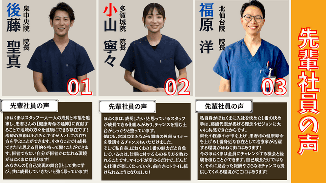 私たちは、多くの人から感謝され、社会に貢献することを通じて、自己実現ができる舞台を提供します。より多くの人に喜んでもらうために学び続ける文化をつくり、成長し続けることで成功を手に入れます。そして、治療家としてだけでなく、人生においてトータルな幸せが得られる組織を目指します。