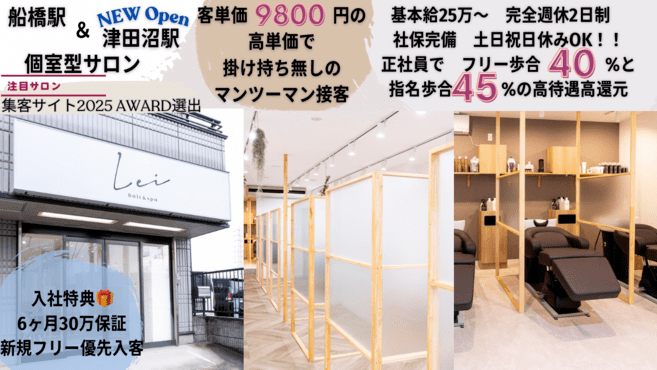 Linoaはお給料も高く、土日でもお休みが取りやすいので、仕事とプライベートの両方を大切にしながら働くことができます。自分の時間を確保しつつ、やりがいのある働き方ができる職場です。一緒に楽しく働ける仲間のご応募を心よりお待ちしています♪サロンの雰囲気も明るく、相談しやすい環境です。ぜひご応募ください☆