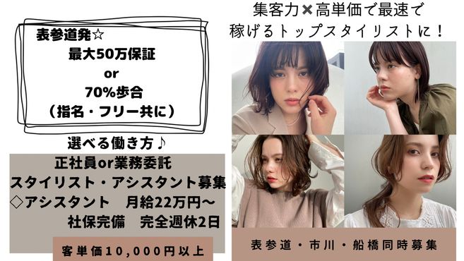 表参道発【高単価×集客力】で安心して稼げる環境を整えたハイクオリティーなサロンです!