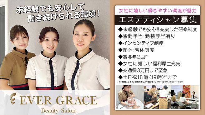 - 「EVER GRACE」は目元ケアを始め、ボディ、フェイシャルまで総合的に美しさをプロデュースするトータルビューティサロンです。
