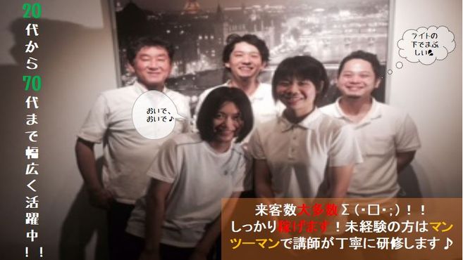 【未経験の方】施術未経験の方は概ね30時間ほどの研修を講師がマンツーマンでいずみ中央店にて行いますのでご安心ください。その後、フォローアップ研修として、デビューしてからも定期的に技術による不安点や相談等を伺い、改善や修正等のサポートをし、安定した技術を体得できるように一緒に取り組んでまいります。