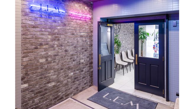 店舗の内装はシックで落ち着いた雰囲気の店内、外看板にはネオンのロゴを用いており、