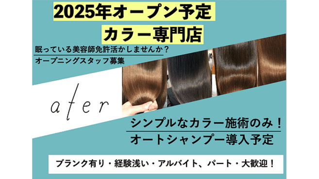 覚えて頂く施術内容はシンプルなカラー(白髪染めリタッチ、全体染め・低明度おしゃれ染めリタッチ、全体染め)オートシャンプーの入れ方のみです。会計業務はセルフレジを検討しております。またカウンセリングなどもシートを用いて行うことを検討しておりますので、美容師経験のある方は、技術の差、解釈の差が出ないように簡単なマニュアルを覚えて頂くだけで、すぐ施術者として業務にあたって頂けます。また経験のない方でも、施術内容をシンプルなカラーに絞っているので、簡単な研修を受けて頂くだけで、施術者になって頂く事が可能です。