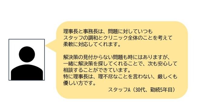 2007年に開業以来、医院を運営していく中でスタッフの重要性を感じています。忙しい中、日々働いてくださるスタッフの方々には本当に感謝しています。しかしながら、結婚・出産といったタイミングで仕事を離れなければいけなくなってしまう事も多くあります。一度職場を離れたスタッフが復帰しやすいよう、今いるスタッフが『働き続けたい』と思えるよう、新人教育の改善や育休制度の推奨、事業所内保育園の開設など労働環境の改善や環境整備に力を入れています。これからもより働きやすい環境を整え、同じ目標を持ってくれるスタッフの方々とやりがいを感じながら働いていければと考えています。