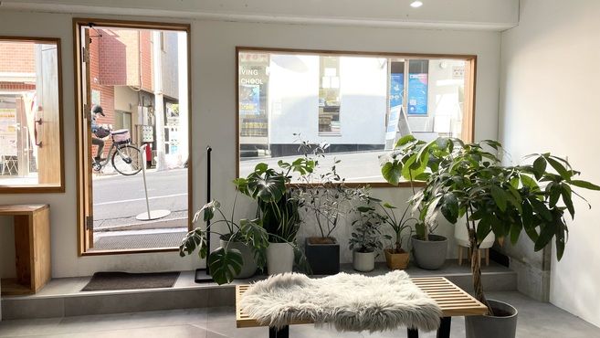 窓の大きさが際立つと思いますが、フロアが少し下がった位置になりますので、通行人と目が合わず絶妙に作られているため、外からの目が気にならず過ごしていただけます。路面店ではありますが、デメリットが少なく且つ認知をされやすいので、ご新規様も多くいらっしゃいます。