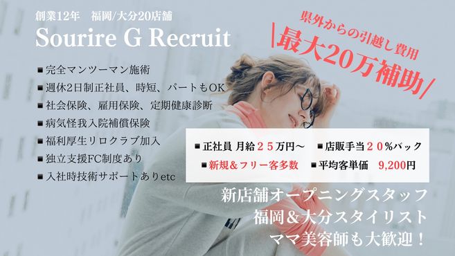 - Sourireでは「スタッフが満足して働ける環境をつくり、長く働いてもらう事。」これこそがお客様への最大のサービスであると考えております。