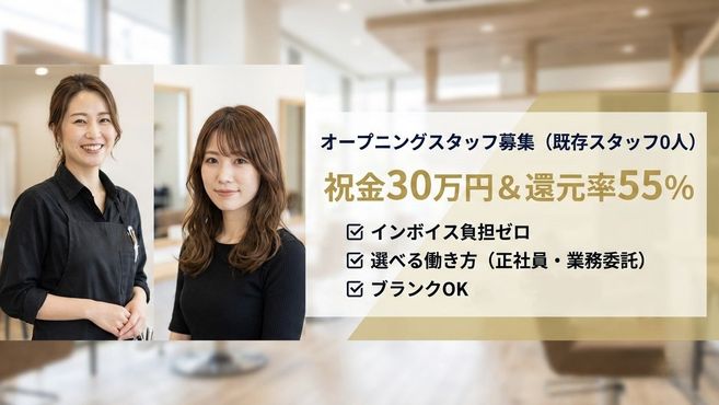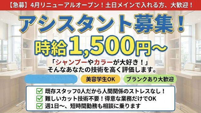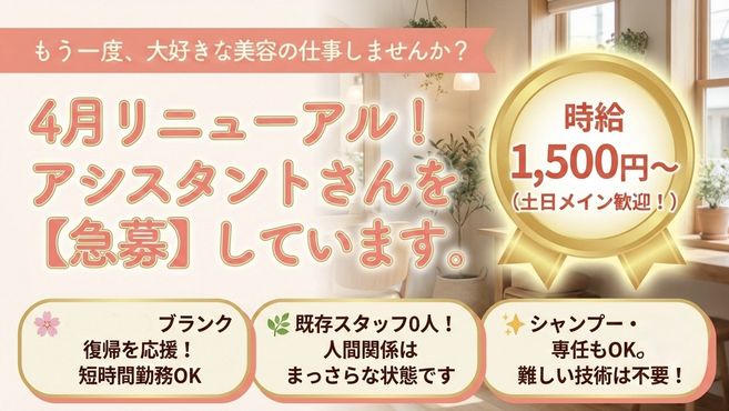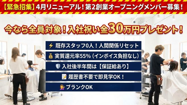 現在は1日5〜6名のマンツーマン施術ですが、フリー45%・指名50%という還元率のおかげで、前職よりゆとりを持って働けているのに、月収は大幅にアップしました。3月からの単価アップ戦略で、さらに「質」の高い美容師を目指せるとワクワクしています!