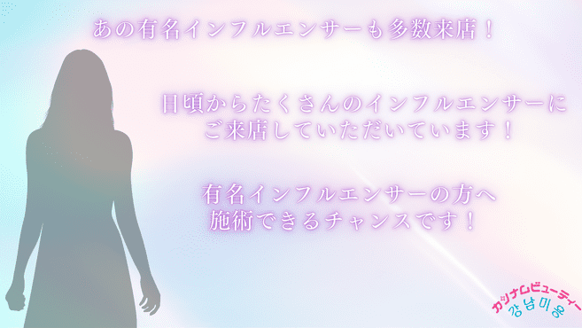 「インフルエンサーに施術してみたい」「トレンドに敏感な方々と関わりながら美容の仕事をしたい」そんな方にはぴったりの職場です。お客様に最高の美を提供するだけでなく、自分自身も常に最前線の技術や情報に触れながら成長できる環境が整っています。美容業界に興味がある方や、トレンドを追求しながらキャリアアップを目指したい方、ぜひ私たちと一緒に働きませんか?