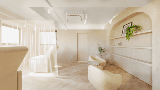 ベージュトーンで落ち着くお洒落な店内の空間。