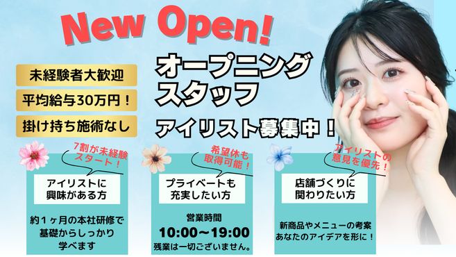 未経験歓迎 / アイリスト / 研修制度充実 / インセンティブ制度 / まつエクなし / まつげパーマ / 交通費支給 / 大手サロン