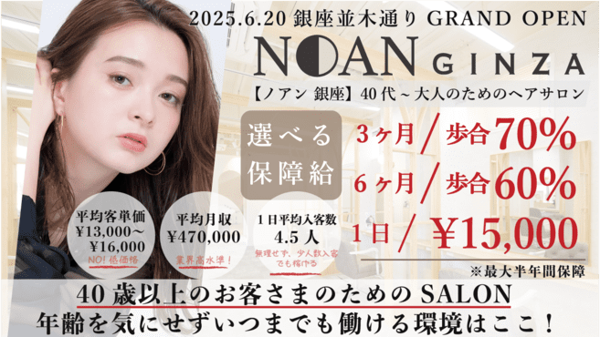 【ベテランと言われる世代の美容師さんが求められています!】NOAN GINZAでは集客するお客様は、40代以上の大人世代の質の良いお客さまに狙いを定め集客するので、お客様に求められているのは、同じ40代以上の大人世代の美容師さんです。