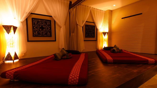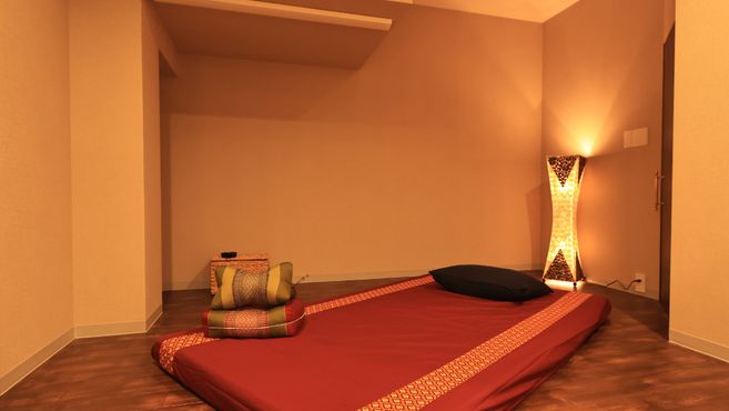 深紅のマットとクッションが温もりを添え、まるでバンコクの高級スパのような非日常のリラクゼーションを体感していただけます。