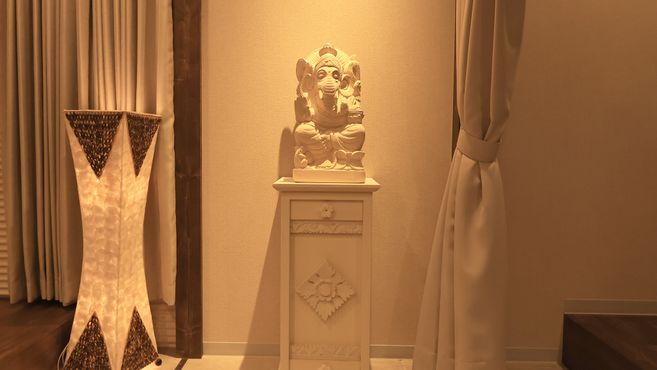 中央には幸福と繁栄の象徴であるガネーシャ像が静かに佇み、訪れるお客様を優しく迎え入れます。