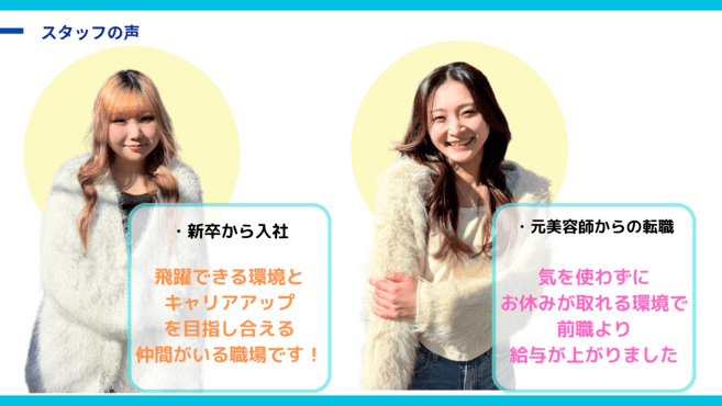 サロン自体も成長段階にあり、やる気次第でポジションアップや新しい挑戦も可能。