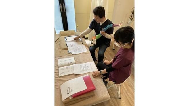 まず技術面では、希望制の技術研修を実施。当院で導入しているショックウェーブ治療(体外衝撃波治療)・筋膜リリース・骨盤調整・モビライゼーション・トレーニング指導・自費診療の組み立て方など、現場で即使える内容を実践形式で学べます。**「患者さんの変化がすぐ出せる技術を身につけたい」**という方には特に好評で、現場とリンクした学びが深まります。