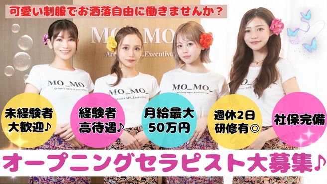- AromaSPA MO_MO_はオールハンドによるアロマトリートメント専門店です。集客力には自信があり、オープンしてわずかでエリアアクセス数予約数TOP、新規来客数やリピート率が高く技術力もお客様より高評価を頂いております。あなたも癒しのプロになりませんか?