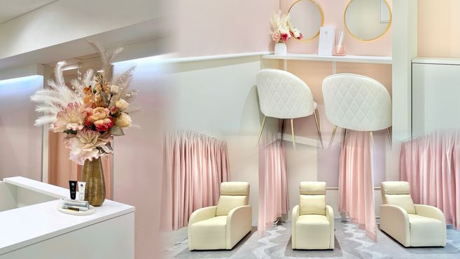 ブランドカラーである 白とピンクを基調とした、清潔感あふれる可愛い店内 が特徴です。