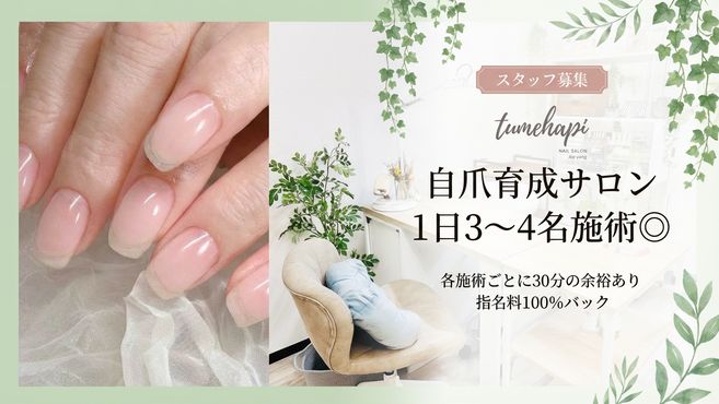 - 通常の約2倍の工程で甘皮や角質まで丁寧に整え、仕上がり・モチ・満足度を高めるケア特化型サロン《tumehapi(ツメハピ)》。ただ塗るだけではない“本質的な美しさ”を提供しています。1日3〜4名のゆとりある予約設計で、お客様一人ひとりに向き合える環境です。