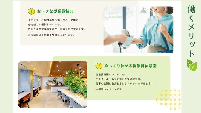 また、従業員休憩室や施設内社割もあるため、休憩はしっかり落ち着いて取れて、お仕事帰りにお買い物も♪
