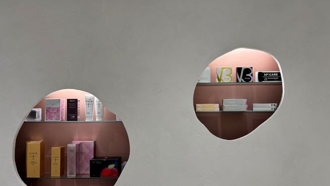 丸くくり抜かれたデザインの中に、ピンクを基調とした商品棚を配置し、