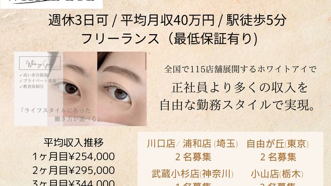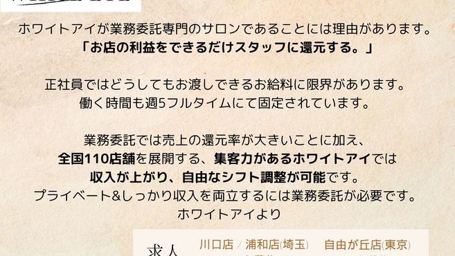 全国110店舗出店のホワイトアイグループでは、アイリストスタッフへの還元を第一に、40%〜50%の売り上げをお給料としてお支払いさせていただいております。