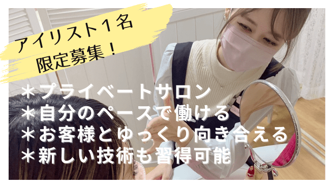 2席だけのプライベートサロンです。落ち着いた雰囲気でお客様と向き合えるサロンです。お客様は顧客様からのご紹介、ご新規様と様々ですが、ゆっくりと過ごしたいと言うお客様が多く、お気に入りサロンを見つけたいと思ってご来店いただくことが多いと感じています。お客様としっかり向き合いたい。新しいことにチャレンジしたいと思っているアイリストさん、お待ちしております!