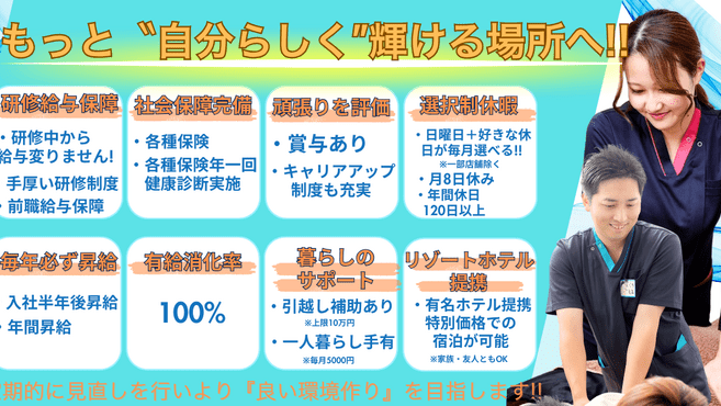 優しいだけではなく時には厳しいと感じることもあるかもしれませんがより良い対応力・より良い施術力へアップデートしていけるモチベーションの高い力のあるスタッフばかりなので自分自身の成長をしっかり感じられると思います☆