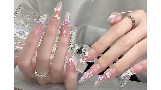 指先が光をまとったようにきらめくクリアのロングフォルムが、手元をより繊細で華奢に見せてくれます。