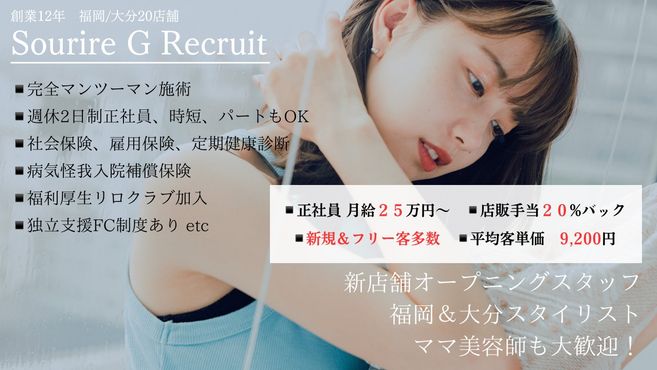 - Sourireでは「スタッフが満足して働ける環境をつくり、長く働いてもらう事。」これこそがお客様への最大のサービスであると考えております。