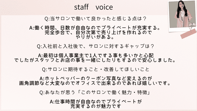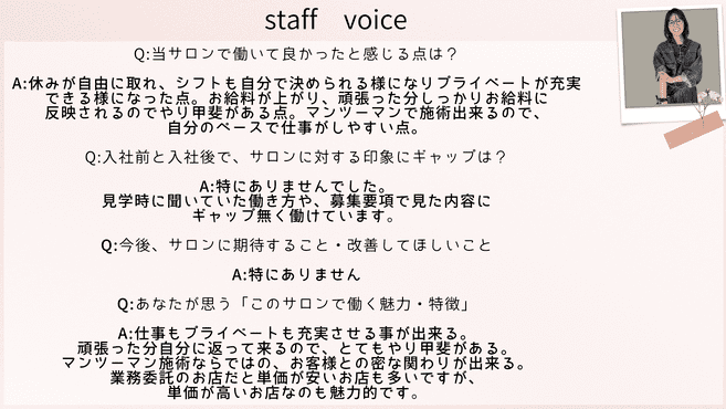 お客様の単価も高く、安売り集客をしていないのもあり、素敵なお客様が多いのは魅力の一つです。