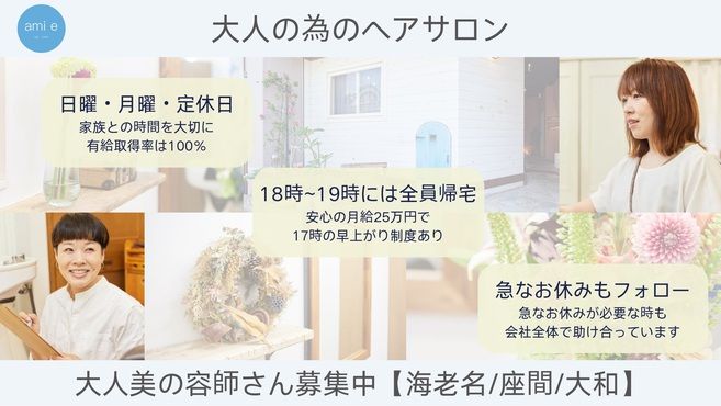 ami e hair roomは、「大人の美容師さんが安心して、長く、自分らしく働ける場所をつくりたい」という想いから生まれた美容室です。