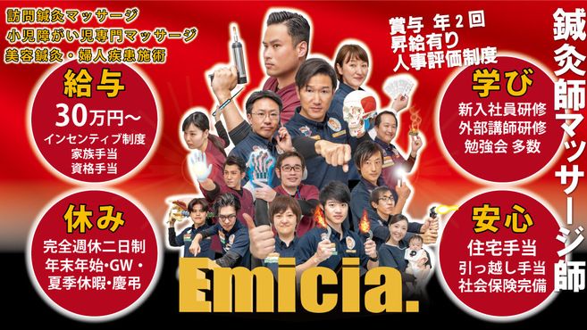- エミシアは、鍼灸接骨院・脳梗塞リハビリ・訪問鍼灸マッサージを軸に、医療・介護・スポーツ分野を横断して人の「改善」と「成長」に本気で向き合う治療グループです。現在は陸上クラブのスポーツトレーナー活動を行い、今後はサッカー・バスケットボールなど地域の小中高校生クラブへも支援を拡大予定。未経験・新卒からでも段階的に学べる教育体制で、技術・知識・人間性を磨き、患者様・地域・社員すべてにおいて業界No.1を本気で目指しています。