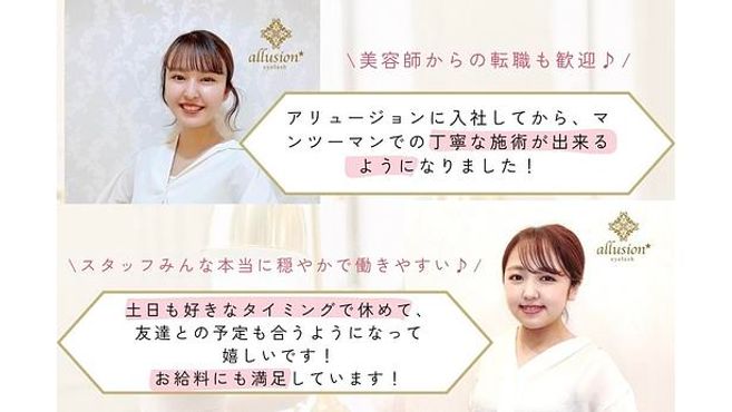 シフトの自由度が高く、土日が月2回とれて連休も取れる為、旅行などの予定が立てやすく、プライベートがとても充実しています!給与に関しても他サロンのアイリストの友人の話を聞くと、アリュージョンはかなり高いです!