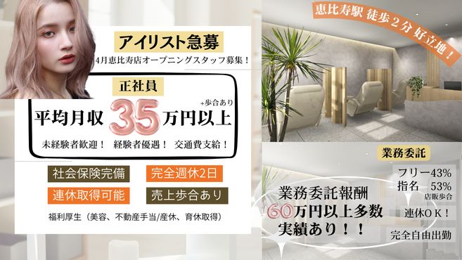 目黒駅から徒歩2分の好立地にてアイリストの募集になります!