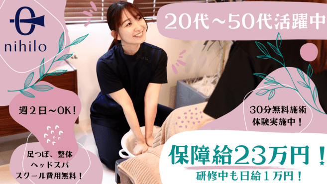 ☆主婦・OLから未経験でもOK!手に職付けて稼げます! ☆指名数で歩合アップだから月収40万円以上のスタッフ多数在籍! ☆提携スクールにて全8回の無料研修(日給10000円、交通費支給)受けられます。 ※リピート率80%以上の講師歴10年のベテラン講師から直接指導が受けられるので短期間で取得が可能。 ※国際リフレクソロジスト、国際整体師、国際ハンドリフレクソロジスト、講師資格が取得可能です。 ※継続的な技術レベルのアップを図るため、社内インストラクターから直々に勤務中に指導が受けられます。 ※磨き上げた技術だから身体の負担もなくスキルUPがはかれます。 1、研修は少人数制のスクール形式です。 スタッフ1-2名に対し、講師1人のマンツーマン授業です。 2、10~30分ショート研修でスキルUP 勤務中でも悩んでいることがあれば、空き時間などを利用して、その場で問題解決していきます。 3、必要に応じてコミュニケーション研修 高リピート率の秘訣は会話術にもあり。苦手な方でも、ポイントを抑えたトーク術を教えます。 ☆研修中も日当10000円支給